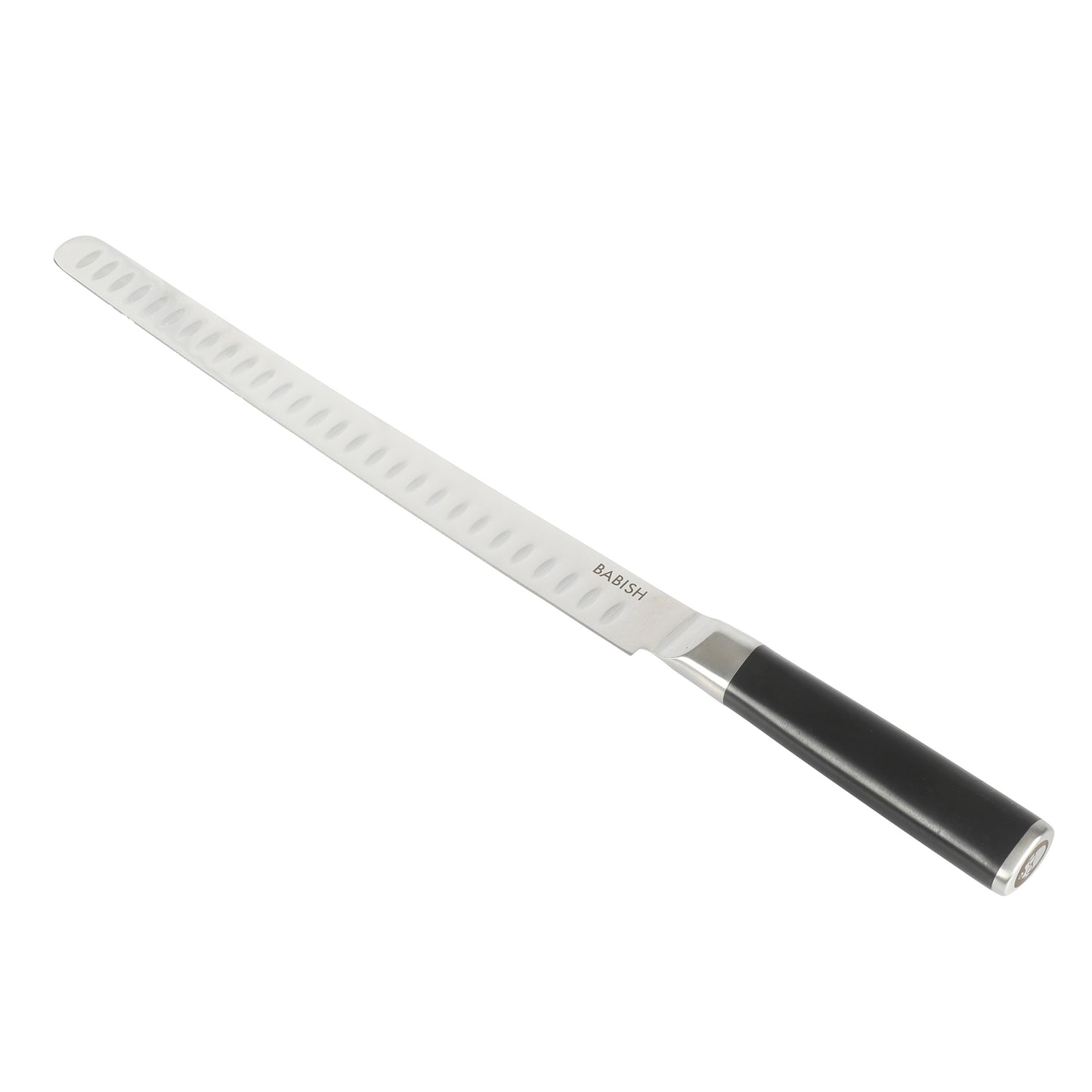The Babish 12-inch German Steel Super Slicer Knife boasts maximum sharpness and efficiency to swiftly cut and serve slices of meat, glazed ham (or bone-in jamón serrano), fish and more. Constructed from high-carbon, 1.4116 German steel, the extra-long blade features a full tang construction to promote balance and even weight distribution. Double-bolstered handle provides a safe and supported grip for better control. Perfect for everyday use and special occasions, this precision-forged knife is easy to clean and maintain. Hand wash only. Towel dry immediately.