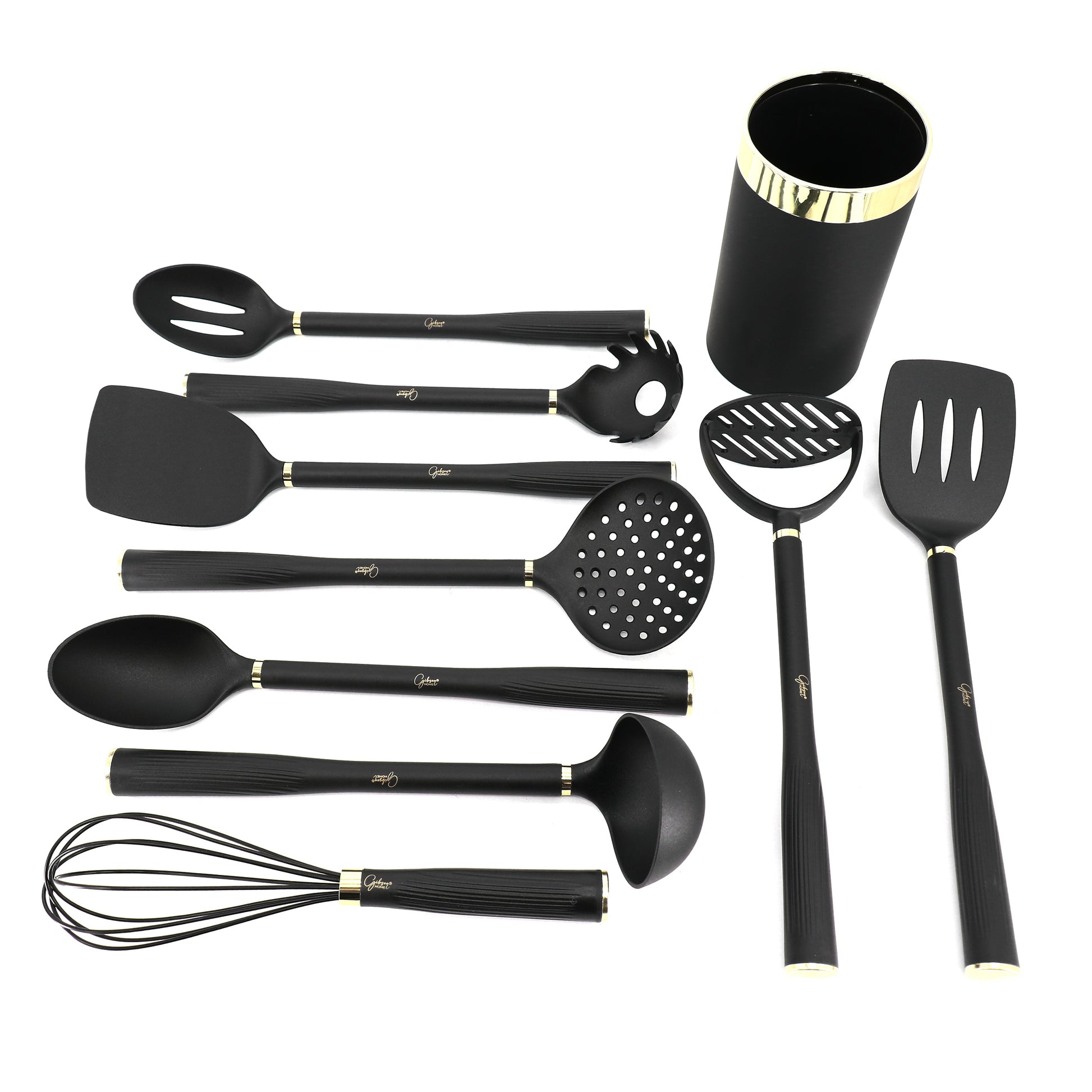 Have all the kitchen essentials with this Gibson Home Hampsbridge 10 Piece Kitchen Tool Set and Utensil Crock. This set including one whisk, ladle, masher, pasta server, spoon, slotted spoon, skimmer, turner, slotted turner, and crock contains all you need to prepare and cook a variety of dishes. Made from nylon, these tools are super lightweight and soft enough to not scratch your cookware. Sturdy, ergonomic handles make these tools comfortable to hold no matter what task. The sleek black color with gorgeous gold accents will look fantastic on your kitchen counter.