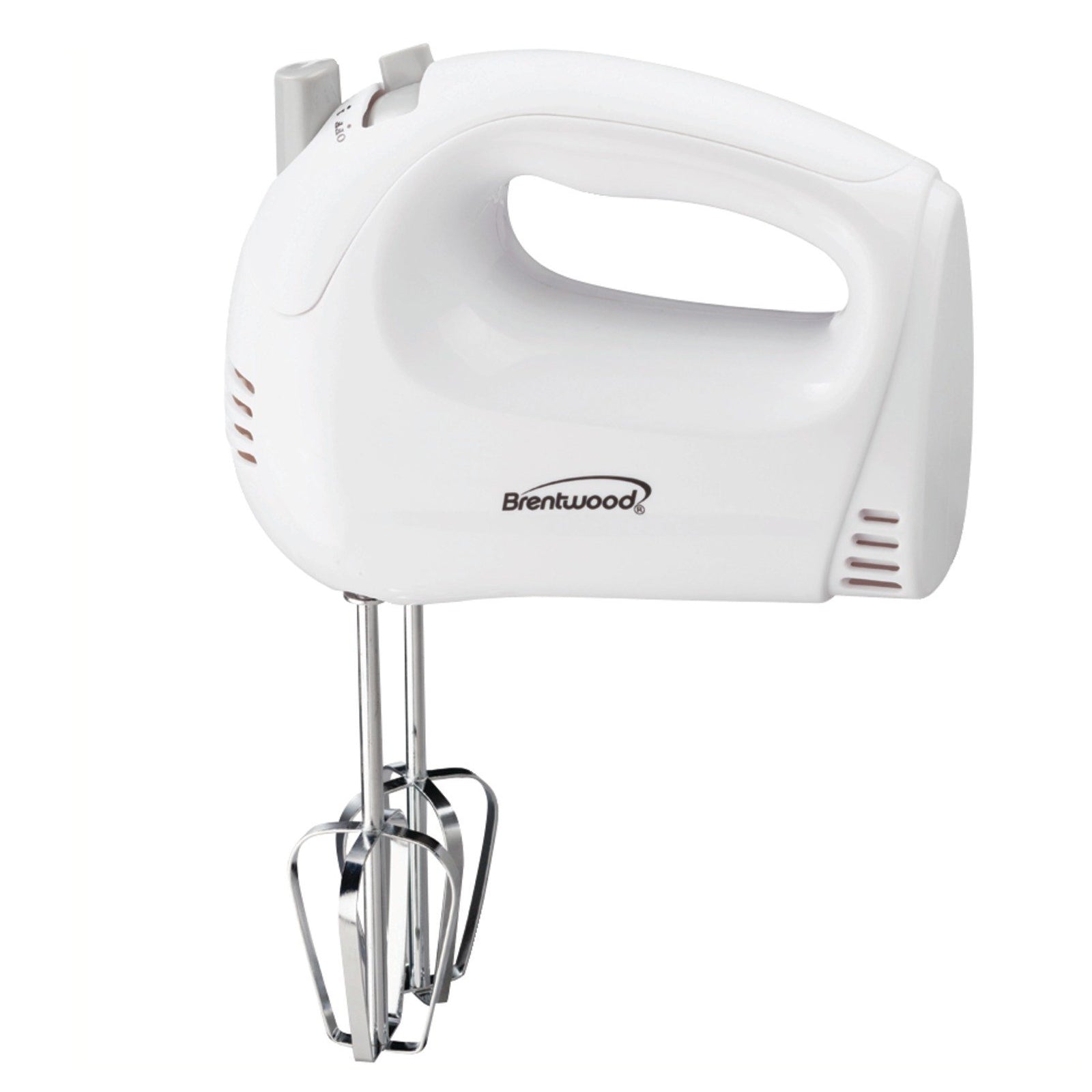 Mixing ingredients has never been easier! make your ultimate best dishes with great results from this easy to use and lightweight Brentwood 5-Speed Hand Mixer in White. The elegant design is a sure fit for your kitchen collection. The compact design enables easy handling while in use. Complete with 5 Speeds for your preference, it has an ejection button for easy cleaning, and comes with two heavy duty chrome plated beaters.