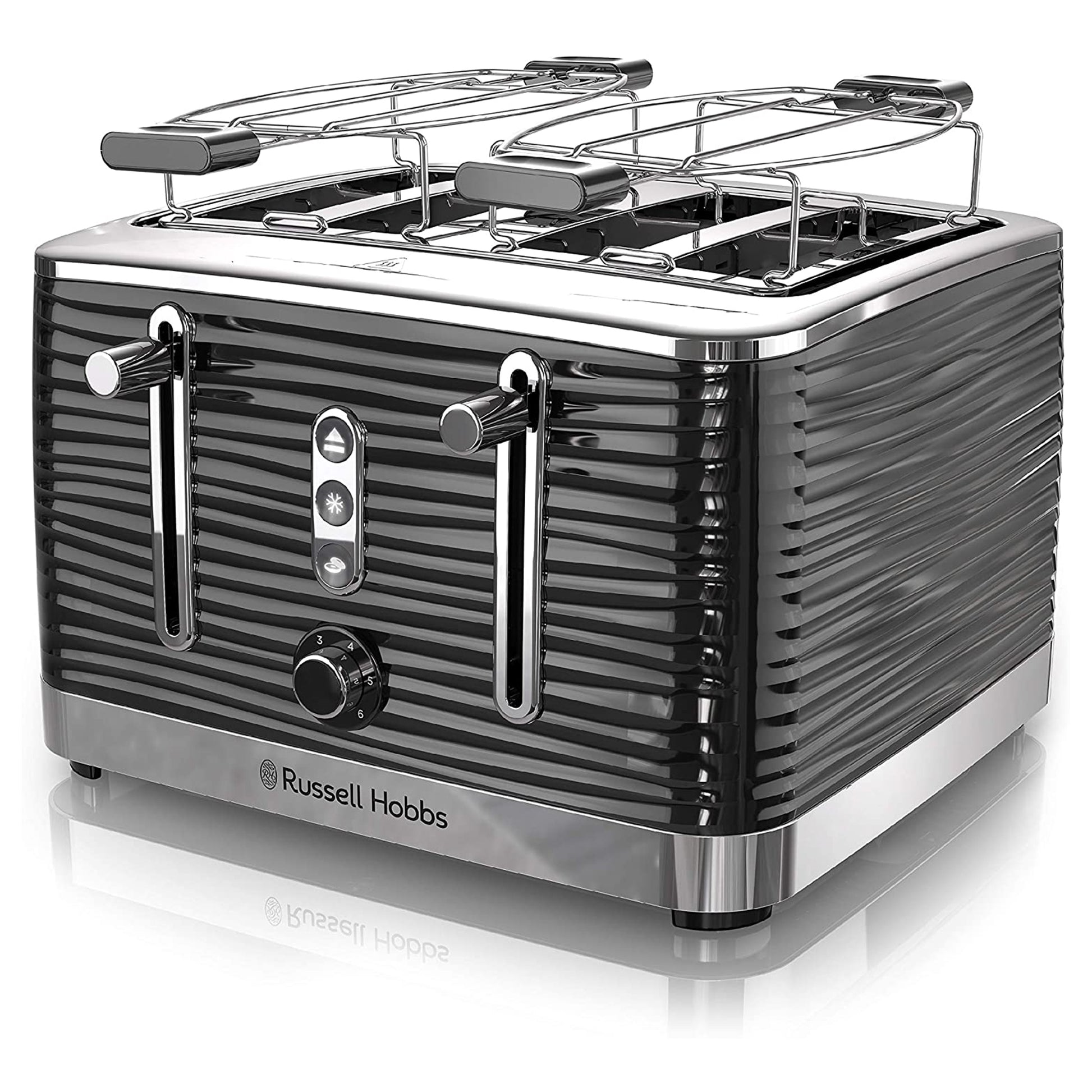 From the heart of England to the heart of your home, the Russell Hobbs Coventry 4-Slice Toaster brings premium aesthetics to your kitchen. The variable browning control ranges from 1 (light) to 6 (dark) to satisfy all preferences. Choose the Bagel function for a perfectly toasted cut side with a warmed bottom side, or the Frozen setting for fresh-like results. This toaster comes with a removable warming rack that quickly heats buns, pastries, and rolls. Plus, the removable crumb tray ensures easy cleanup.