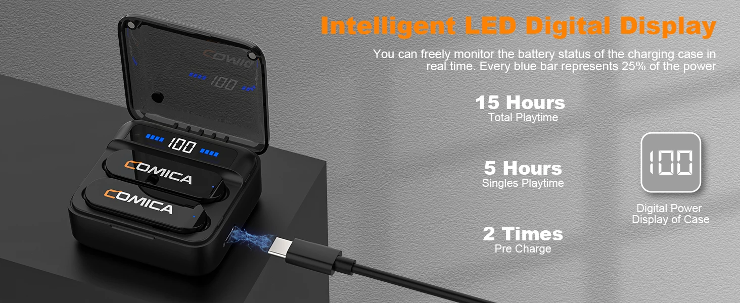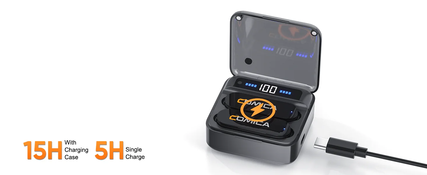 Charging Case: 2 times for two transmitters and one receiver charged simultaneously