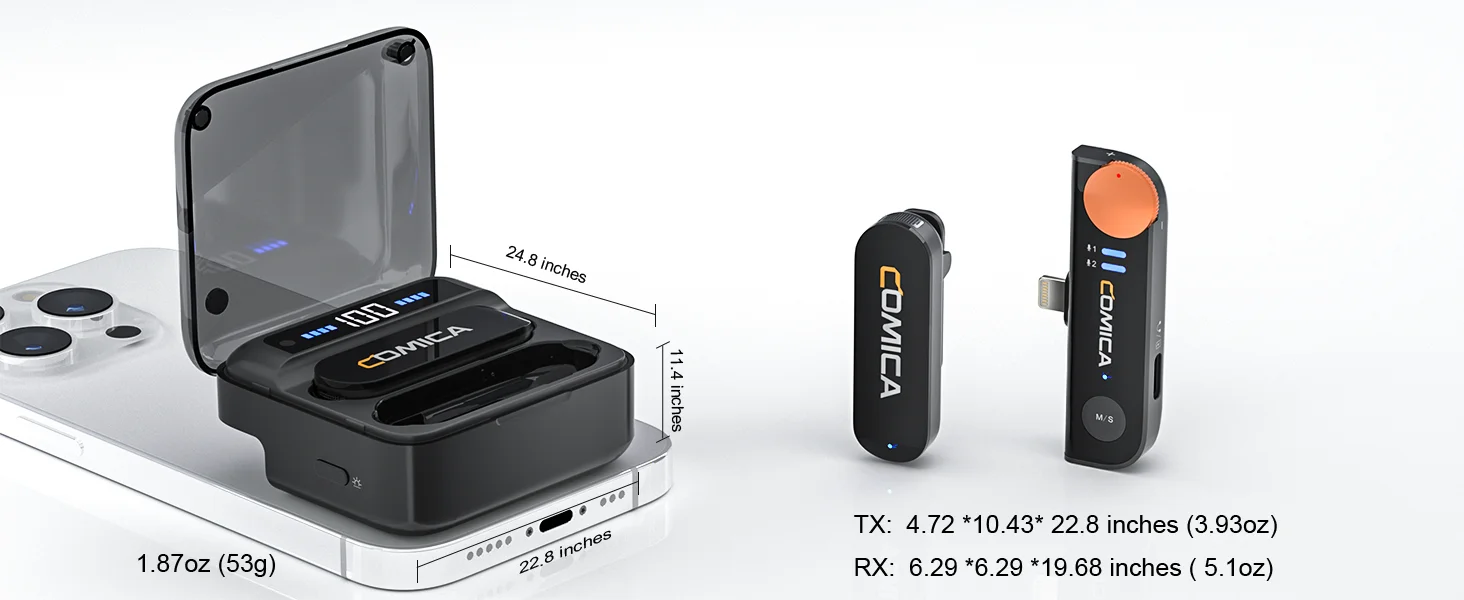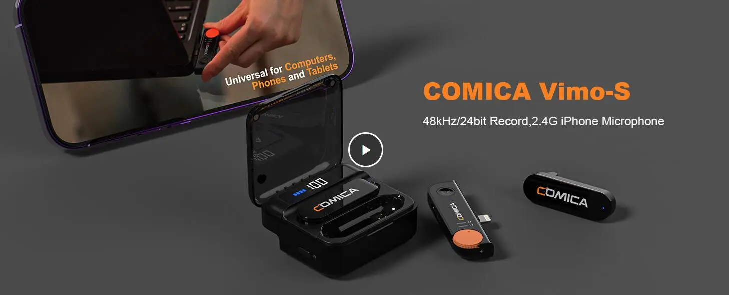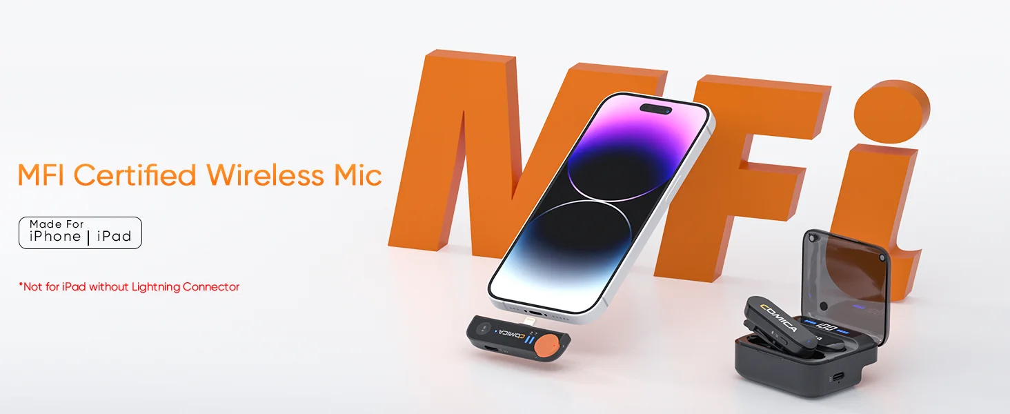 Wireless Mic for iPhone with Lightning Connector: Comica Vimo S MI iPhone wireless microphone enrolled in the MFi Program and officially got the Apple MFi certification, which means that you can be sure that the VIMO S MI you purchase for your Apple device is verified by Apple to be safe and compatible.
