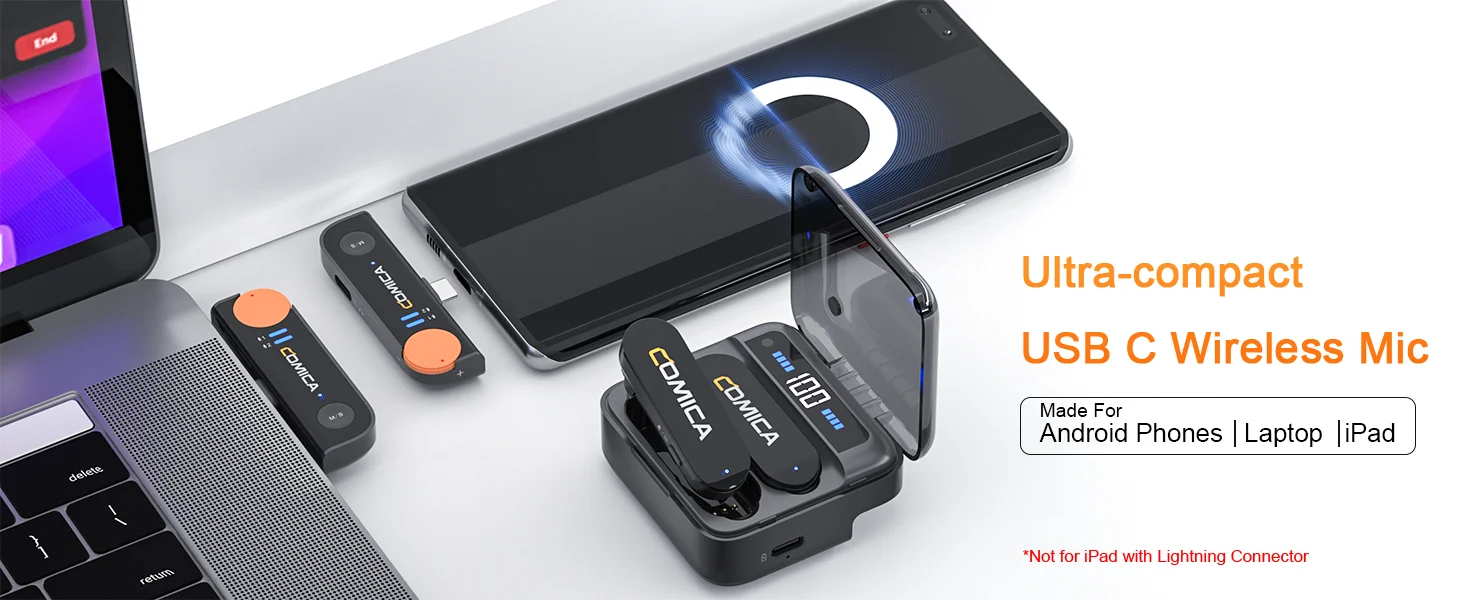 USB Type-C Wireless Mic System: Comica Vimo S UC wireless microphone is specially for smartphones/ tablets/laptops with a USB-C connector. Ideally use for iPads with USB C connectors, Android Phones, and tablets with USB C input jacks.